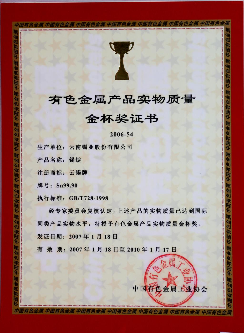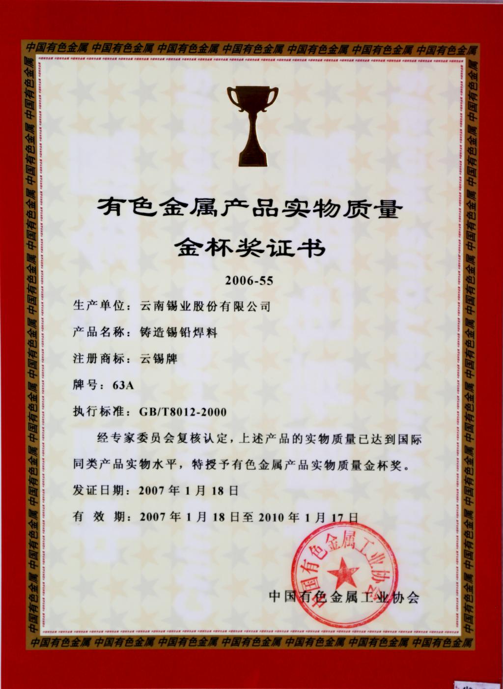 云錫牌鑄造錫鉛焊料獲有色金屬產(chǎn)品實(shí)物質(zhì)量金杯獎(jiǎng)證書