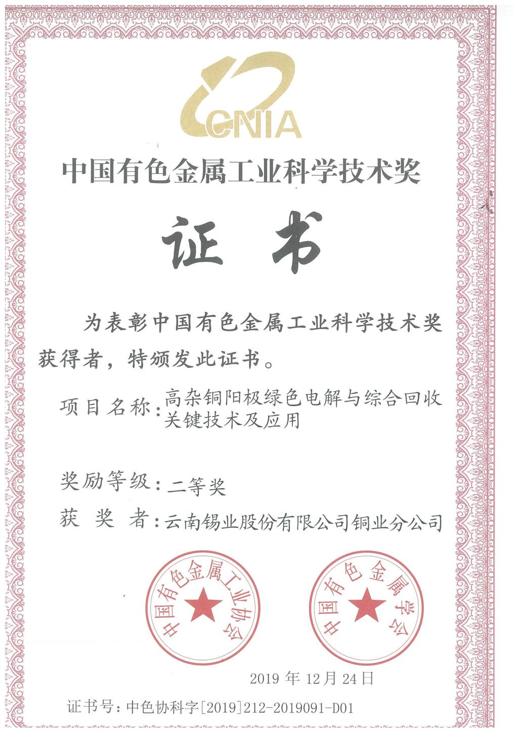 近日,銅業(yè)分公司收到中國(guó)有色金屬工業(yè)協(xié)會(huì)頒發(fā)的榮譽(yù)證書(shū),銅業(yè)分公司申報(bào)的《高雜銅陽(yáng)極綠色電解與綜合回收關(guān)鍵技術(shù)及應(yīng)用》榮獲中國(guó)有色金屬工業(yè)科技進(jìn)步二等獎(jiǎng)。
