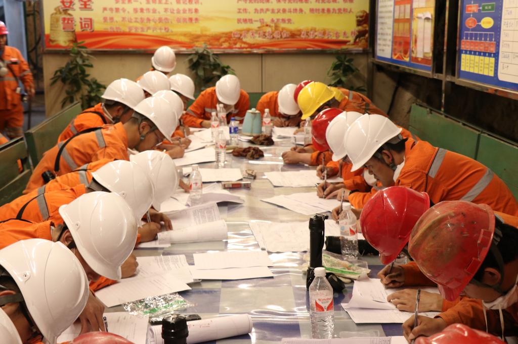 參賽人員經(jīng)過安全員入坑安全培訓(xùn)后前往本次考試地點(diǎn)塘子凹坑的主力采場(chǎng)3-11-5E,由于高手云集,最后一輪比賽標(biāo)準(zhǔn)更高,要求更嚴(yán)。比賽現(xiàn)場(chǎng),選手們信心滿滿,躍躍欲試,氣氛嚴(yán)肅卻又不失親切。拿到考題后認(rèn)真勾畫,緊抓重點(diǎn)。在迎頭上,選手們沉著迎戰(zhàn),從容不迫,認(rèn)真排查現(xiàn)場(chǎng)與施工單上“異樣”,反復(fù)查看,爭(zhēng)取不漏任何細(xì)節(jié)。