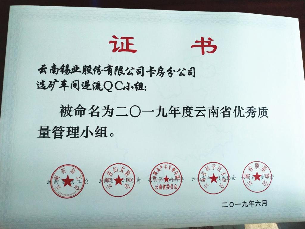 6月27日,在云南省質量協(xié)會QC成果發(fā)布會上,卡房分公司選礦車間逆流QC小組榮獲2019年度云南省優(yōu)秀質量管理小組榮譽稱號。