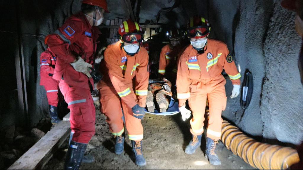 在制定科學救援方案后,救援隊員佩用正壓式氧氣呼吸器,攜帶雷達生命探測儀、熱成像儀、氣體檢測儀、對講機和個人防護裝備等進入巷道冒頂區(qū)域進行現(xiàn)場安全確認和被困人員搜尋,經雷達生命探測儀搜尋顯示3名被困人員有生命體征,但現(xiàn)場一氧化碳濃度78ppm超標,需對救援現(xiàn)場進行機械通風,巷道冒頂嚴重,需進行支護。在把現(xiàn)場搜尋情況及時層層匯報后,救援隊員攜帶風機、風帶、支護材料和破拆工具等設備分兩個組先后進入事故現(xiàn)場,照明、通風、巷道支護作業(yè)隨即鋪開。準備工作就緒后,現(xiàn)場救援人員采用《礦山(隧道)事故救援聯(lián)絡信號》聯(lián)絡被困人員,救援隊員用細木棍將系有食品、水的導繩從管道送給受困人員,并安撫受困人員情緒。不料,在快速的支護推進中,突然地壓活動頻繁,頂板再次冒落,救援隊在同受困人員保持聯(lián)系的同時,只得暫時退至安全區(qū)域待命。4名專家技術人員再次進入事故現(xiàn)場勘察和評估,經專家技術組確認現(xiàn)場地壓穩(wěn)定,可以向前支護,搶險救援組再次進入現(xiàn)場進行向前支護、清理巷道。鄒文鴻等領導在現(xiàn)場指揮著救援工作,要求救援人員要時刻留意事故現(xiàn)場環(huán)境,保證自身安全才能解救他人。經救援人員的共同努力,生命通道成功打通,被救出的3名受困人員均無大礙,已在醫(yī)務人員的護送下離開事故現(xiàn)場,去往就近醫(yī)院接受系統(tǒng)的檢查和治療。經救援隊現(xiàn)場搜尋確認已無受困人員,鄒文鴻下令各工作組撤離事故現(xiàn)場。