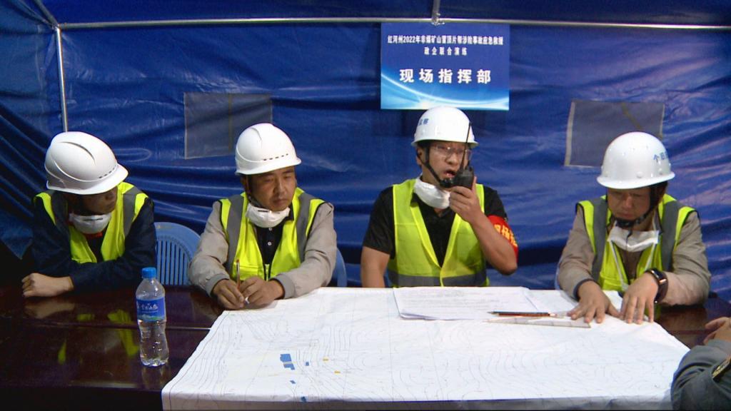 此次演練方式采取實地演練,即在實際環(huán)境下組織專項實兵演練,并采取單頻觀摩的方式進行觀摩?!熬掳l(fā)生冒頂了,井下發(fā)生冒頂了,大家快撤,大家快撤……”井下值班長大聲叫到。演練模擬大屯錫礦1360坑450米探礦平巷掘進迎頭外50米左右突然發(fā)生巷道頂板冒頂坍塌,并將巷道內的風管、水管、電話線、供電線路砸斷,巷道被垮落的支護、巖石堵塞,長度約10米左右,通過查看出入井記錄和人員定位系統(tǒng),核實單班入井人員共26人,安全出井23人,3名人員被困。大屯錫礦逐級上報,州政府應急辦接報后遂啟動《紅河州非煤礦山生產安全事故應急預案》,同時責成各相關部門、單位和救援隊趕赴事故現(xiàn)場展開救援。包括現(xiàn)場指揮、搶險救援、醫(yī)療衛(wèi)生、物資保障在內的9個工作組經短暫集結了解險情后,分別領命向事故地點進發(fā)。與此同時,現(xiàn)場指揮部指揮長、個舊市副市長鄒文鴻等領導,前往現(xiàn)場指揮部指揮救援工作的開展。