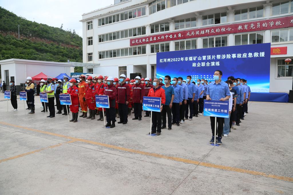 6月23日,由紅河州人民政府主辦、個舊市人民政府承辦、云南錫業(yè)股份有限公司協(xié)辦的紅河州2022年非煤礦山冒頂片幫涉險事故應急救援政企聯(lián)合演練在大屯錫礦舉行。認真學習貫徹落實習近平總書記關于安全生產重要論述,推動各級應急管理責任落實,壓實安全生產責任,切實提高紅河州非煤礦山事故應急救援能力。紅河州人民政府副秘書長楊克平,紅河州應急管理局局長張錳,錫業(yè)股份黨委副書記、董事長、總經理劉路坷,錫業(yè)股份黨委委員、副總經理王建偉,錫業(yè)股份黨委委員、大屯錫礦黨委書記、經理王壽安等出席演練活動。