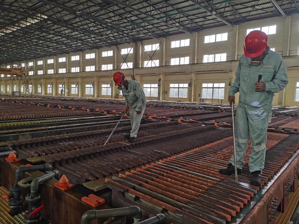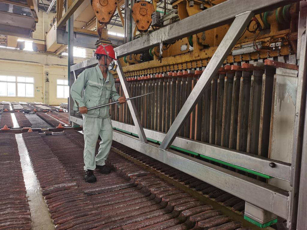 一頂安全帽、一把扁鏟、一身汗?jié)n斑斑的工作服,陪伴出裝槽班組的員工們走遍了電解槽的角角落落。出槽前,出裝組長小毛和行車工小龍一同前往確認(rèn)出槽位置,聯(lián)系循環(huán)崗位,將槽下5系3、4組短路開關(guān)閉合,斷開出槽電流,確認(rèn)無誤后開始出槽。關(guān)閉陰陽極槽進(jìn)液管閥門,接觸點(diǎn)澆一遍電解液,拔開出陰極和殘極槽的上清液鉛塞,排電解液專用吊車起吊陰極和殘極,清洗導(dǎo)電板,清除槽內(nèi)殘存殘極、粒子……每一個(gè)環(huán)節(jié)都緊密斜接,每一個(gè)步驟都熟悉精準(zhǔn),一個(gè)在地上、一個(gè)在“空中”,不知多少次的配合,才換來現(xiàn)在的默契。