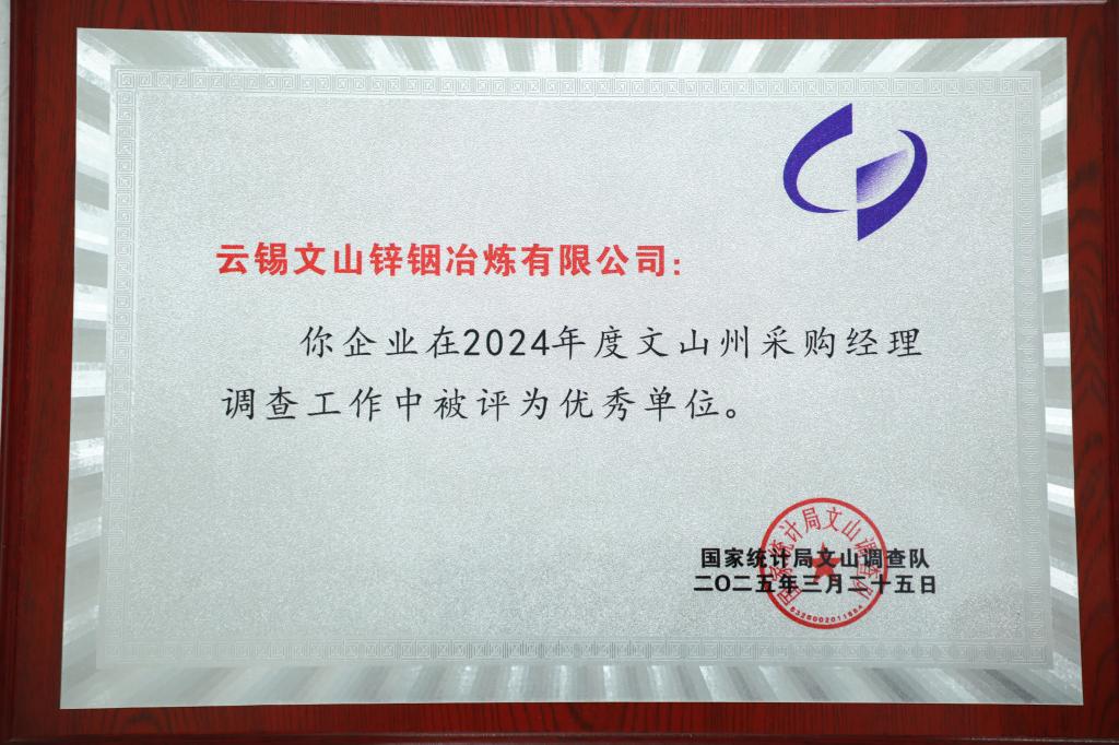 近日,國(guó)家統(tǒng)計(jì)局文山調(diào)查隊(duì)公布2024年度文山州采購(gòu)經(jīng)理調(diào)查工作優(yōu)秀單位評(píng)選結(jié)果,文山鋅銦公司憑借在采購(gòu)經(jīng)理調(diào)查工作中的突出表現(xiàn),獲“2024年度文山州采購(gòu)經(jīng)理調(diào)查工作優(yōu)秀單位”稱號(hào)。