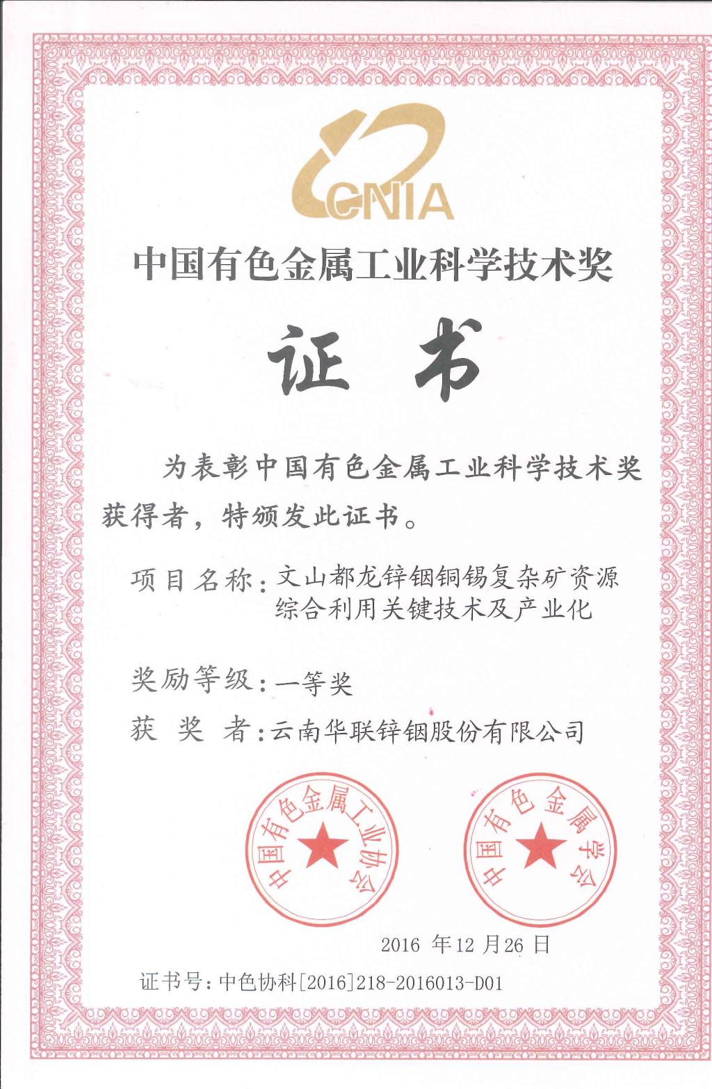 2011年以來累計(jì)投入科研資金3.4億元,實(shí)現(xiàn)科技創(chuàng)效4.74億元,取得了顯著的科技成果,其中,“銦鋅錫銅復(fù)雜多金屬礦資源高效綠色利用關(guān)鍵技術(shù)及產(chǎn)業(yè)化示范項(xiàng)目”榮獲2017年度中國循環(huán)經(jīng)濟(jì)協(xié)會(huì)科學(xué)技術(shù)一等獎(jiǎng);“銦鋅錫銅共伴生多金屬礦資源高效利用關(guān)鍵技術(shù)及產(chǎn)業(yè)化項(xiàng)目”榮獲云南省科技進(jìn)步一等獎(jiǎng);“文山都龍鋅銦銅錫復(fù)雜礦資源綜合利用關(guān)鍵技術(shù)及產(chǎn)業(yè)化項(xiàng)目”榮獲中國有色金屬工業(yè)科學(xué)獎(jiǎng)一等獎(jiǎng)。