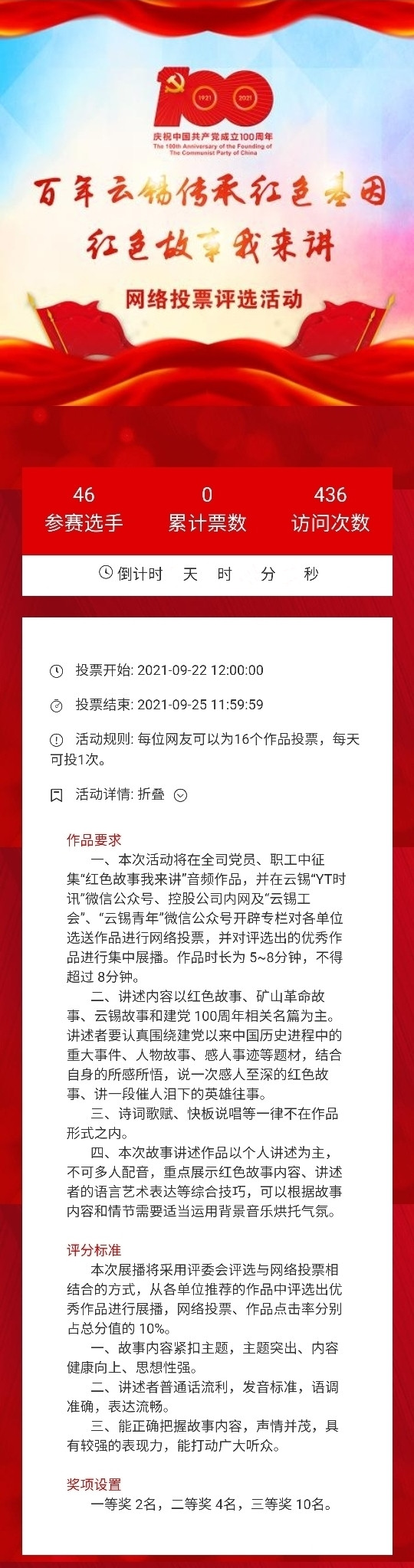 百年云錫傳承紅色基因——“紅色故事我來講”作品展播是云錫控股公司第32屆礦工節(jié)·文化月系列活動(dòng)之一,經(jīng)各單位精心組織,“紅色故事我來講”音頻作品征集工作現(xiàn)已完成,從9月22日12:00至9月25日12:00為網(wǎng)絡(luò)投票時(shí)間,敬請廣大干部職工積極參與并發(fā)動(dòng)身邊的親友參與投票,一起選出心中的優(yōu)秀作品。
