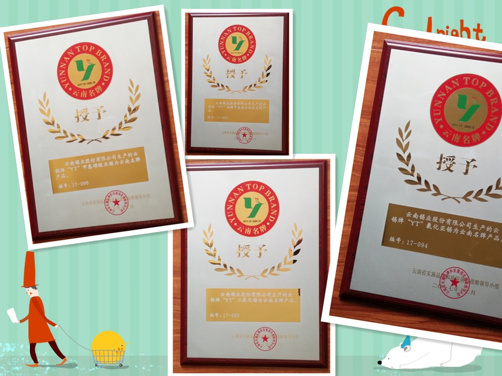 2017年,錫業(yè)股份品牌建設(shè)工作持續(xù)取得成效,新申報(bào)的甲基磺酸亞錫產(chǎn)品通過云南省名牌戰(zhàn)略推進(jìn)委員會審核,被評為云南名牌產(chǎn)品,氯化亞錫、硫醇甲基錫、二氧化錫產(chǎn)品通過復(fù)評,保持證書獲得表彰。
