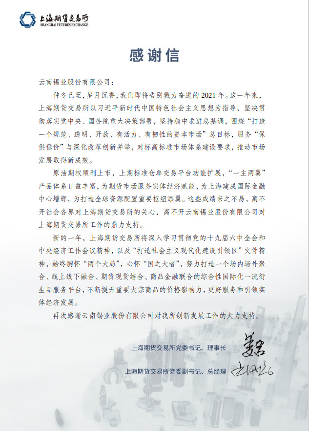 2022年的市場環(huán)境更趨復(fù)雜嚴(yán)峻和不確定,回顧2021年與上期所風(fēng)雨同舟,我們展望2022年與上期所進(jìn)一步加強(qiáng)合作,推動錫產(chǎn)業(yè)高質(zhì)量發(fā)展再創(chuàng)輝煌。
