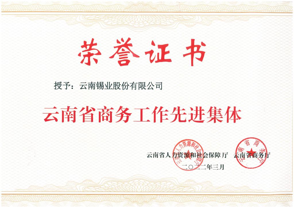 為樹(shù)立典型、弘揚(yáng)先進(jìn)、凝聚力量、激勵(lì)擔(dān)當(dāng),引領(lǐng)全省廣大商務(wù)系統(tǒng)干部職工奮斗新時(shí)代、奮進(jìn)新征程、擔(dān)當(dāng)新使命,云南省商務(wù)廳和云南省人力資源和社會(huì)保障廳2021年12月決定開(kāi)展每五年評(píng)選一次的云南省商務(wù)工作先進(jìn)表彰活動(dòng)。本著堅(jiān)持面向基層,堅(jiān)持評(píng)選標(biāo)準(zhǔn)、依法依規(guī)推薦等原則,以推動(dòng)商務(wù)工作高質(zhì)量發(fā)展為導(dǎo)向,以帶動(dòng)經(jīng)濟(jì)社會(huì)發(fā)展實(shí)績(jī)?yōu)楹饬繕?biāo)準(zhǔn),經(jīng)過(guò)耗時(shí)4個(gè)月的評(píng)選,云南省商務(wù)廳和云南省人力資源和社會(huì)保障廳決定授予云南錫業(yè)股份有限公司“云南省商務(wù)工作先進(jìn)集體”稱號(hào) 。