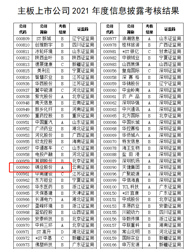 7月4日,深圳證券交易所發(fā)布了《2021年度上市公司信息披露考核結(jié)果》,錫業(yè)股份(000960)考核評價(jià)結(jié)果為最高等級A級,自2017年之后再次回到信息披露考核最高等級陣營。從考核結(jié)果統(tǒng)計(jì)來看,深市上市的2,553家公司中考核結(jié)果為A(優(yōu)秀)的公司家數(shù)僅為454家,占參加考核上市公司總數(shù)的17.78%。其中,云南轄區(qū)考核結(jié)果為A的深市上市公司僅有5家。