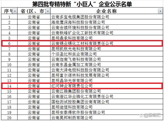 信息顯示:云南省共有20家企業(yè)入選國家第四批專精特新“小巨人”企業(yè)名單,云錫錫化工、紅河砷業(yè)公司2家單位榮登榜單。