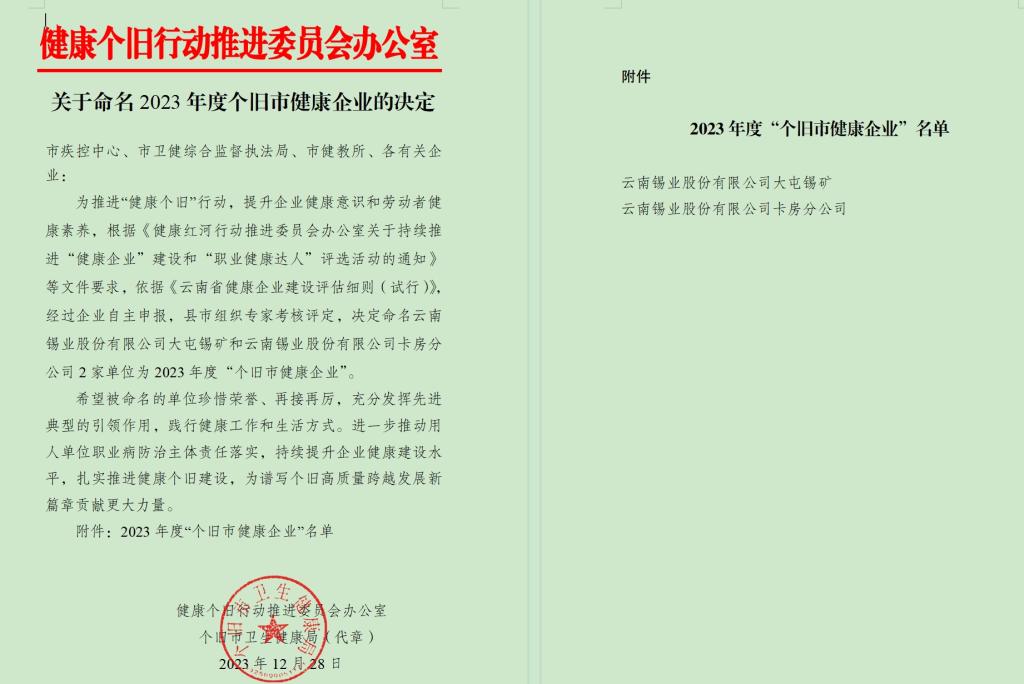 近日,2023年度“個(gè)舊市健康企業(yè)”名單揭曉,此次評(píng)選個(gè)舊市全市僅有云錫大屯錫礦、卡房分公司2家單位榮獲此殊榮。