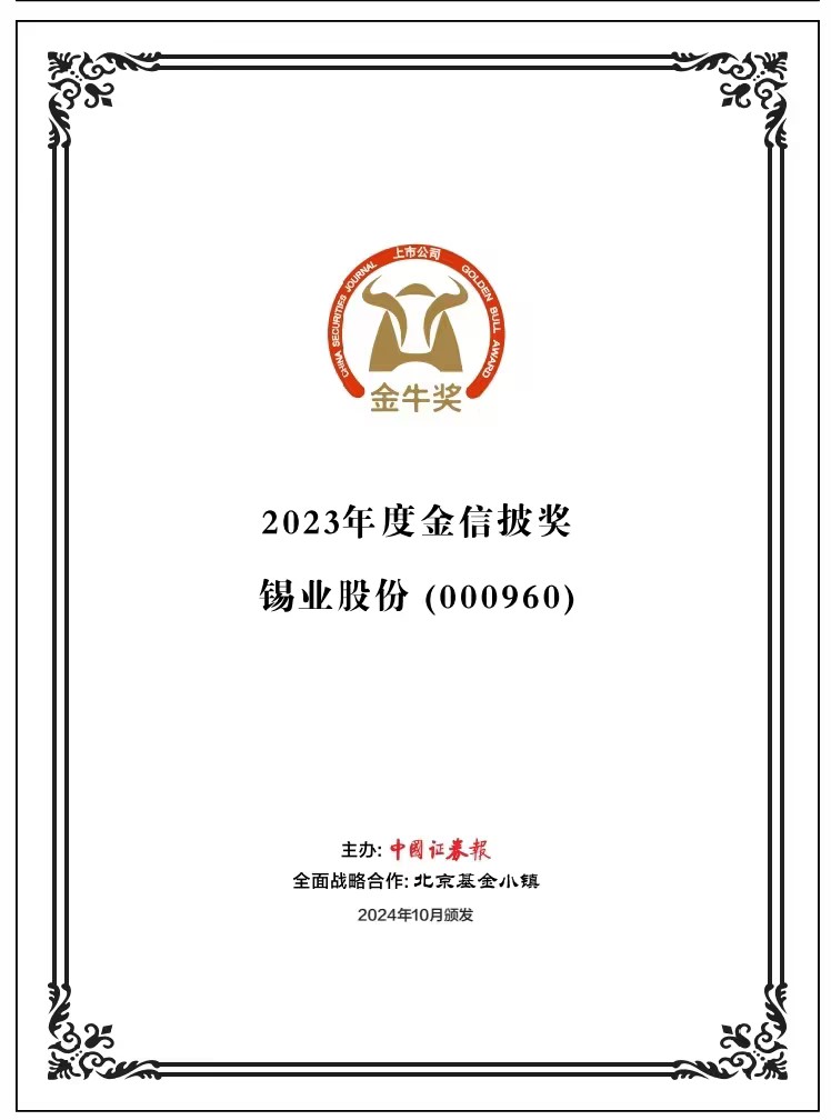 10月24日,中國證券報正式揭曉了2023年上市公司金牛獎榜單,錫業(yè)股份(000960)榮獲“2023年度金信披獎”。從評價結(jié)果統(tǒng)計來看,入圍參選樣本的4208家A股上市公司中僅有不超過450家獲獎,占入圍上市公司總數(shù)不到11%。“2023年度金信披獎”評價重點考慮上市公司的信息披露質(zhì)量和效率。評選組委會根據(jù)上市公司年報質(zhì)量、審計情況、交易所信息披露考評等指標(biāo)進行綜合判斷,并最終評選出在信息披露方面表現(xiàn)較為突出的上市公司。