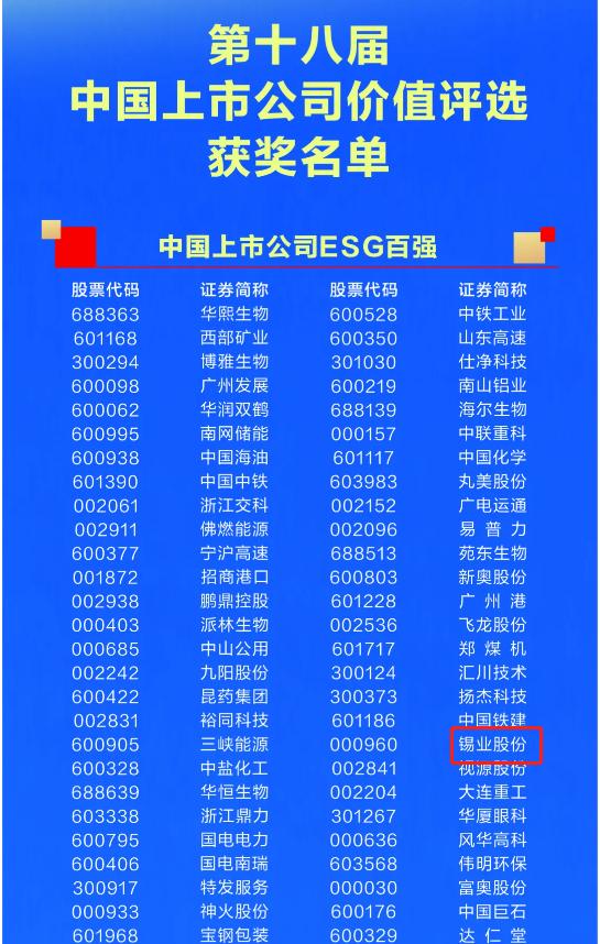 同日,證券時報主辦的“第十八屆中國上市公司價值論壇暨2024新質(zhì)生產(chǎn)力巡禮長三角行”在江蘇昆山舉辦,會議在全面考量上市公司經(jīng)營、財務(wù)、創(chuàng)新、市場影響以及社會責(zé)任等各方面表現(xiàn)的基礎(chǔ)上評選出了“2024中國上市公司ESG百強”榜單,錫業(yè)股份成功入選。此次榮獲2023年度金信披獎及“2024中國上市公司ESG百強”稱號是公司高質(zhì)量發(fā)展、全方位綜合實力不斷增強的體現(xiàn),更是各界評委對公司規(guī)范運作、信息披露、環(huán)境保護、社會責(zé)任履行及公司治理等工作的充分肯定。