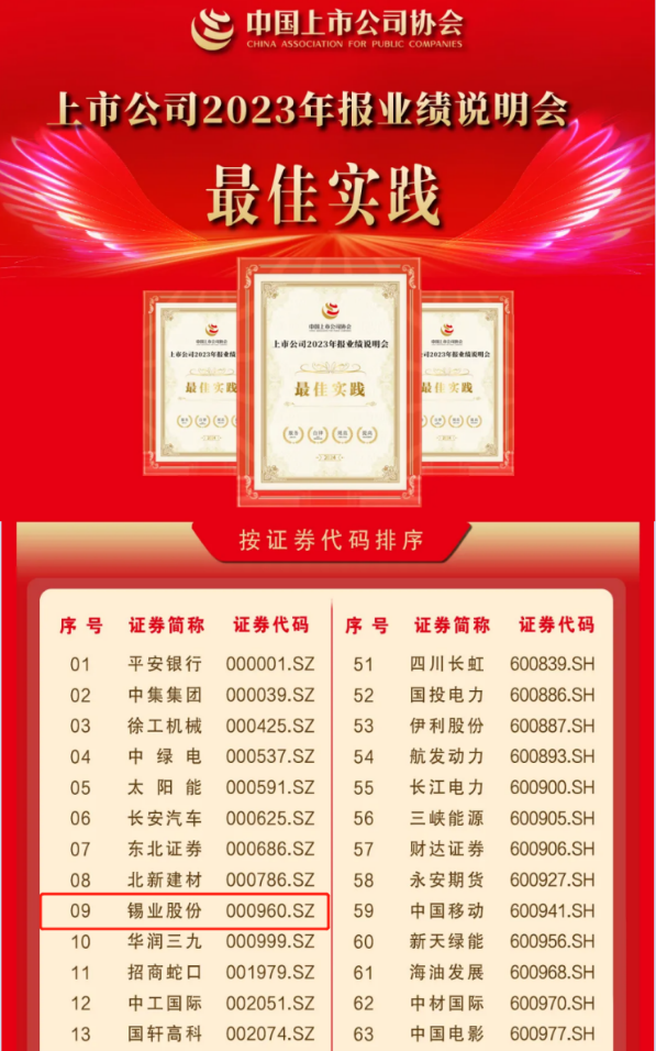 在2023年報(bào)業(yè)績說明會(huì)最佳實(shí)踐評(píng)選活動(dòng)中,經(jīng)各地證監(jiān)局、滬深北交易所及投服中心充分溝通交流,綜合形成100家“2023年報(bào)業(yè)績說明會(huì)最佳實(shí)踐”和366家“2023年報(bào)業(yè)績說明會(huì)優(yōu)秀實(shí)踐”上市公司名單,錫業(yè)股份成為全市場中獲“最佳實(shí)踐”殊榮的100家上市公司之一。錫業(yè)股份已連續(xù)四年通過視頻直播方式召開年報(bào)業(yè)績說明會(huì)并不斷創(chuàng)新,2023年報(bào)業(yè)績說明會(huì)上,公司充分利用當(dāng)前蓬勃發(fā)展的AI與虛擬現(xiàn)實(shí)技術(shù),向市場充分展現(xiàn)錫作為算力金屬在人工智能發(fā)展中所扮演的最核心基礎(chǔ)底層邏輯。公司與投資者互動(dòng)的深度和廣度不斷拓展,提升了彼此溝通的高度、厚度和溫度,令投資者“獲得感”滿滿。