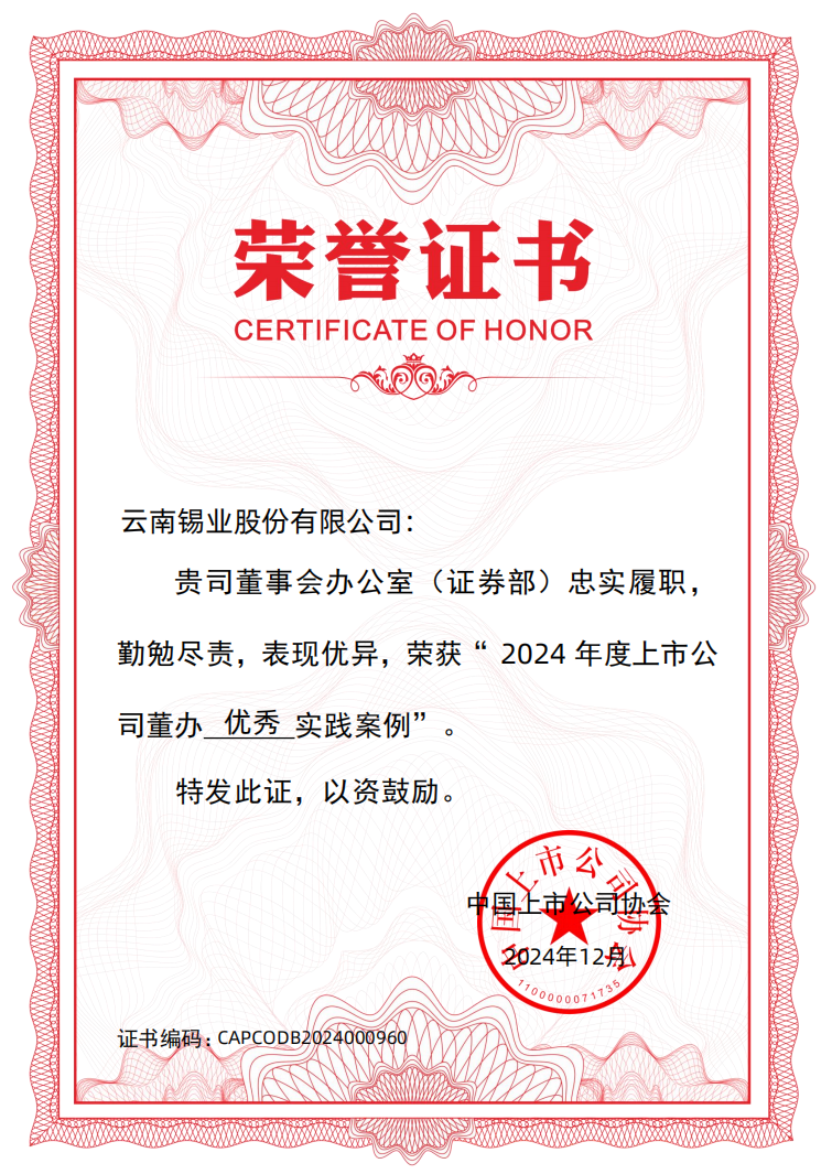近日,在中國上市公司協(xié)會舉辦的“上市公司董辦最佳實踐”案例征集活動中,錫業(yè)股份成功入選“2024年度上市公司董辦優(yōu)秀實踐案例”。