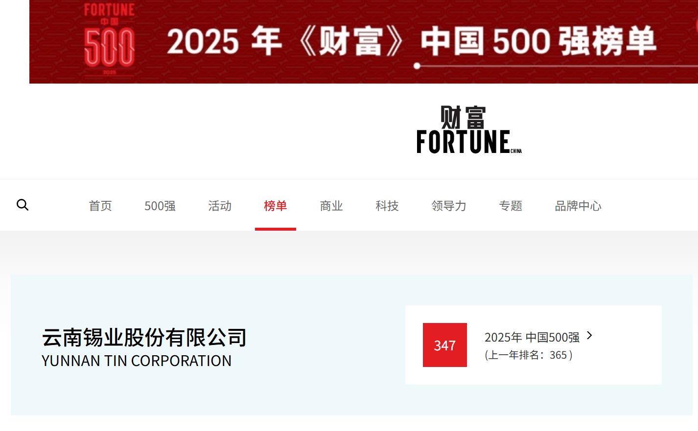 7月22日,2025年《財(cái)富》中國(guó)500強(qiáng)排行榜發(fā)布,錫業(yè)股份位居第347位,較去年排名上升18位。