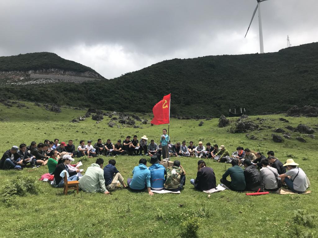 當(dāng)天,朝陽(yáng)燃燒著晨霧,清晨的空氣中帶著些許熱意。一坑的60名黨員在黨旗引領(lǐng)下,浩浩蕩蕩向目的地進(jìn)發(fā),徒步路線從2095老礦區(qū)開(kāi)始到猴子山風(fēng)力發(fā)電站腳,共約15公里。路途中,曾在老礦區(qū)待過(guò)、年紀(jì)稍長(zhǎng)的黨員們,指著一處處老舊破敗的建筑向年輕人介紹:“看,那里叫小街子,以前特別熱鬧,人很多”;“那是以前的糧食局”;“以前我們家就在炮臺(tái)旁邊的那幢房子里”……這就是老礦山人曾經(jīng)生產(chǎn)和生活過(guò)的地方,隨著資源的消失、生產(chǎn)中段不斷下降,老礦區(qū)已逐漸衰落蕭條;曾經(jīng)熱鬧熙攘的小街子、電影院、糧食局現(xiàn)在已無(wú)生氣,漸漸被人們遺忘。年輕黨員們看到這些景象,聽(tīng)著前輩們講述曾經(jīng)打拼的故事,紛紛表示要傳承好老一輩礦山人艱苦奮斗的精神,珍惜大好機(jī)遇和礦產(chǎn)資源,為大屯錫礦的建設(shè)發(fā)展不懈努力。